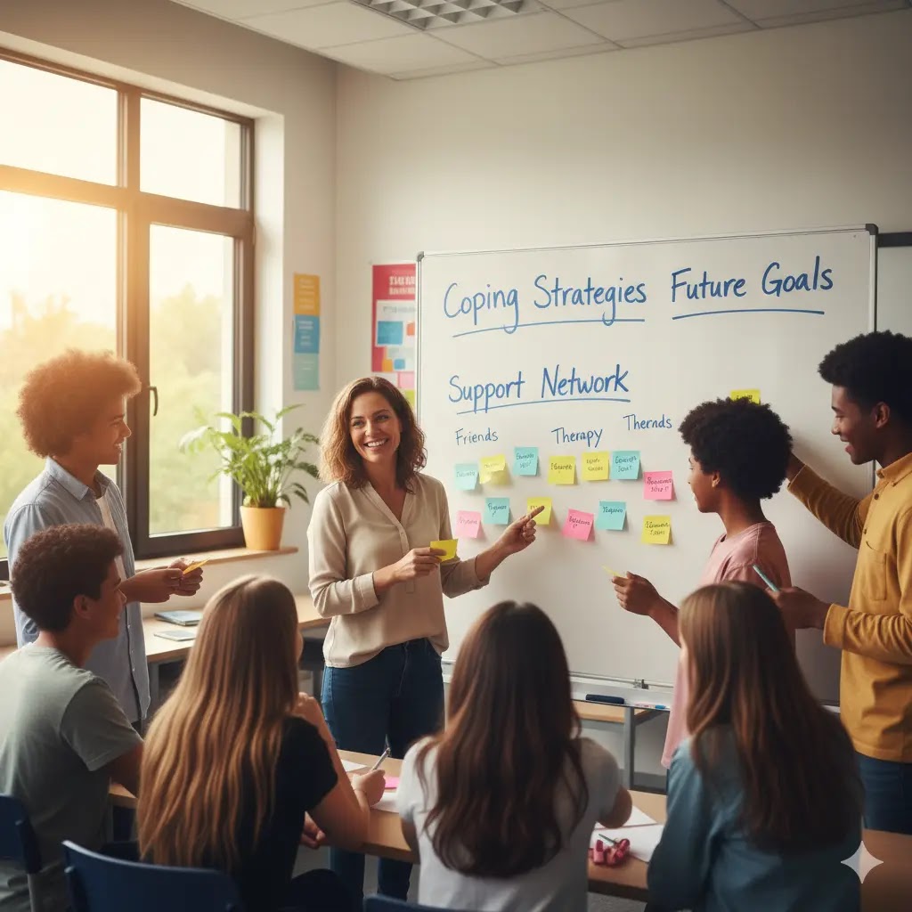 Diverse group of teenagers in a bright classroom participating in a mental health workshop with sticky notes and a whiteboard.