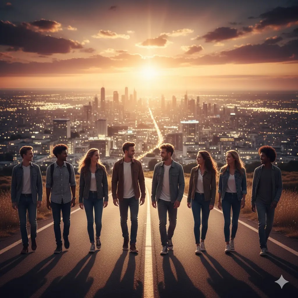 Hopeful diverse group of young adults walking together on a path towards a bright sunrise, supporting each other.