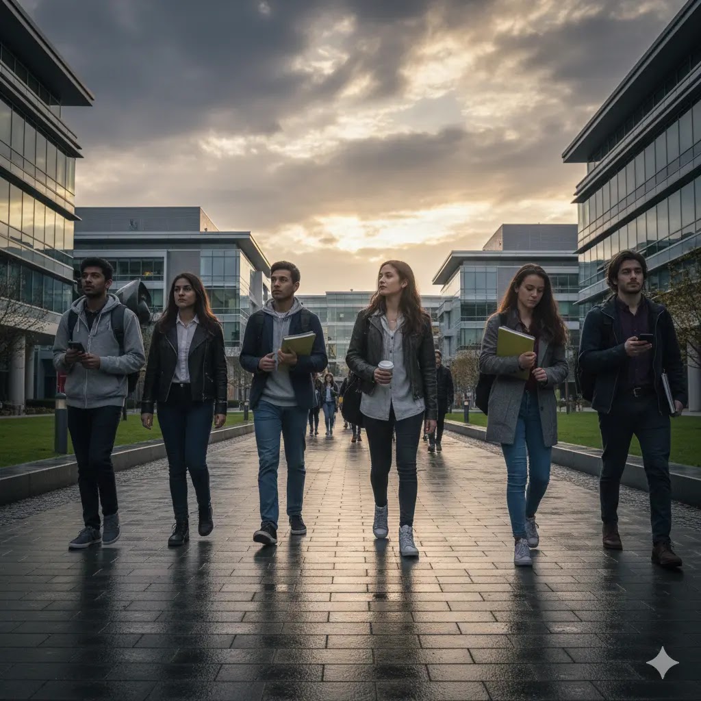 Diverse group of thoughtful young adults walking across a modern university campus under a dramatic sky. mental health crisis among young adults