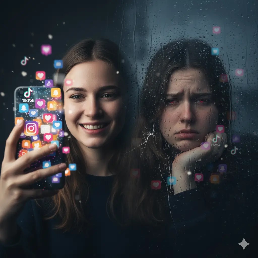 Conceptual split image of a woman taking a happy selfie versus her tired reflection in a window, with social media icons blurred in the background.