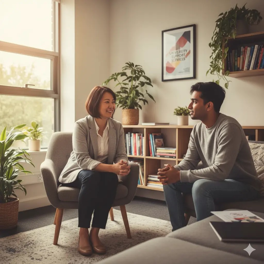 A university counsellor having a supportive and empathetic conversation with a student in a sunny, modern well-being office.
