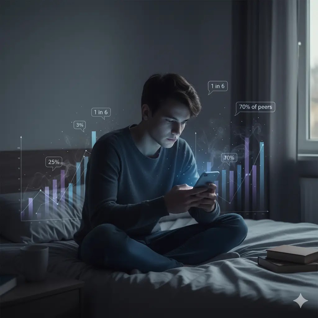 A thoughtful young person on their bed looking at their phone, with transparent statistical graphs overlay in the background.