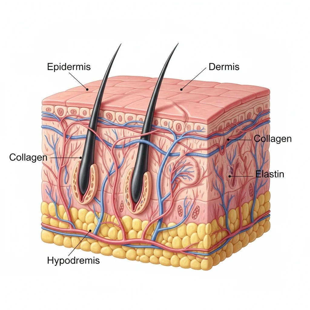 the epidermis (outer layer), the dermis (middle layer), and the hypodermis