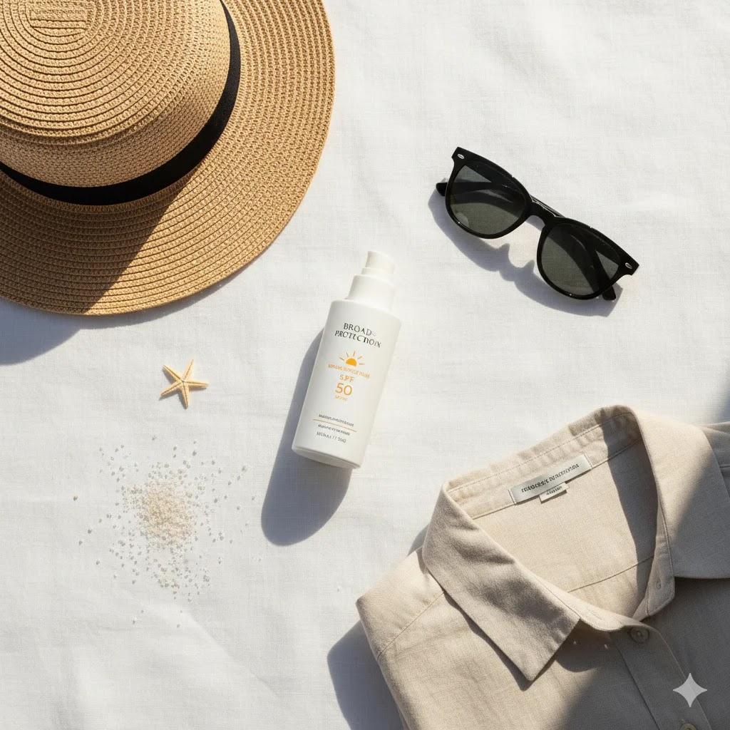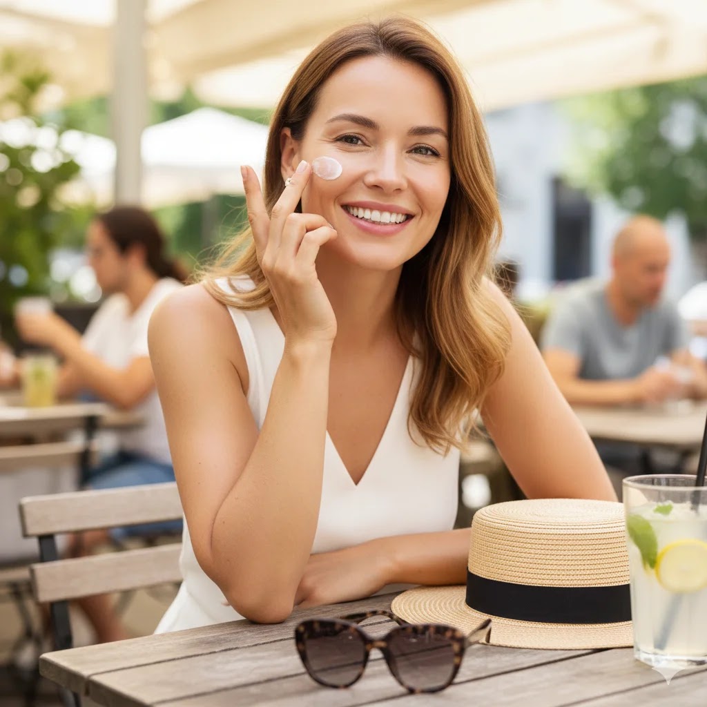 Woman outdoors applying sunscreen to her cheek, wearing a hat and sunglasses for UV protection.