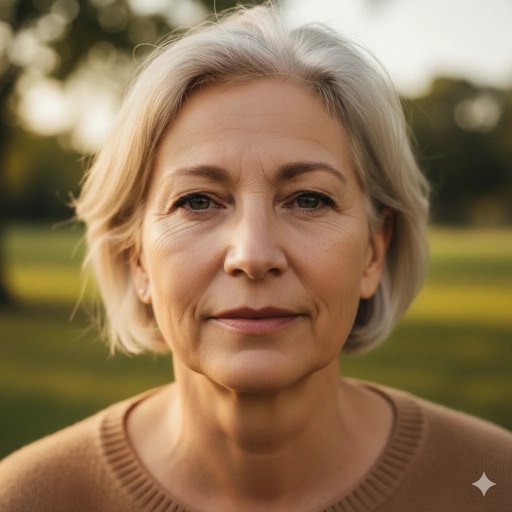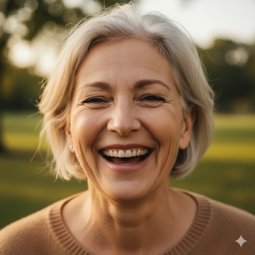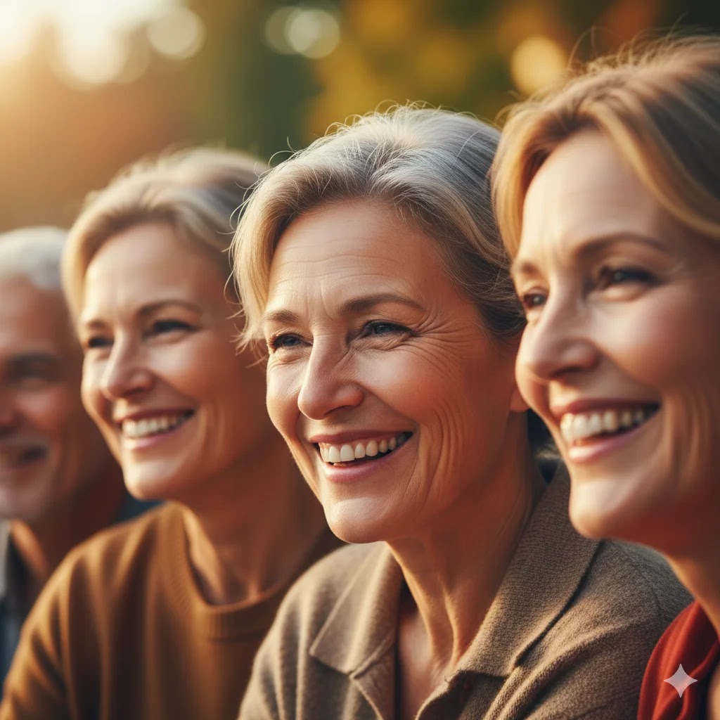A diverse group of confident men and women in their 40s and 60s smiling warmly, showing natural laugh lines and aging skin in soft sunlight.
