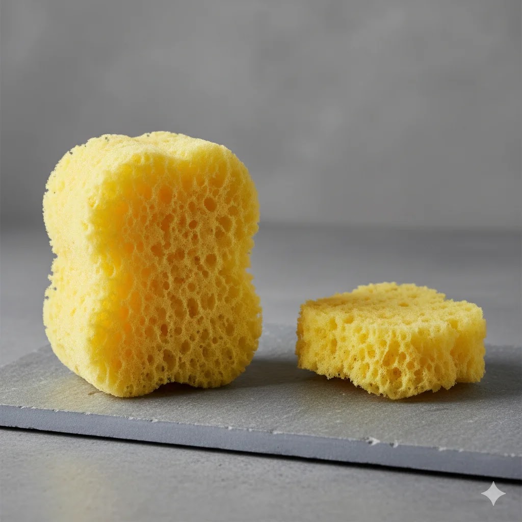 Conceptual still life: a dense sponge next to a thin porous sponge, representing changes in skin structure over time.