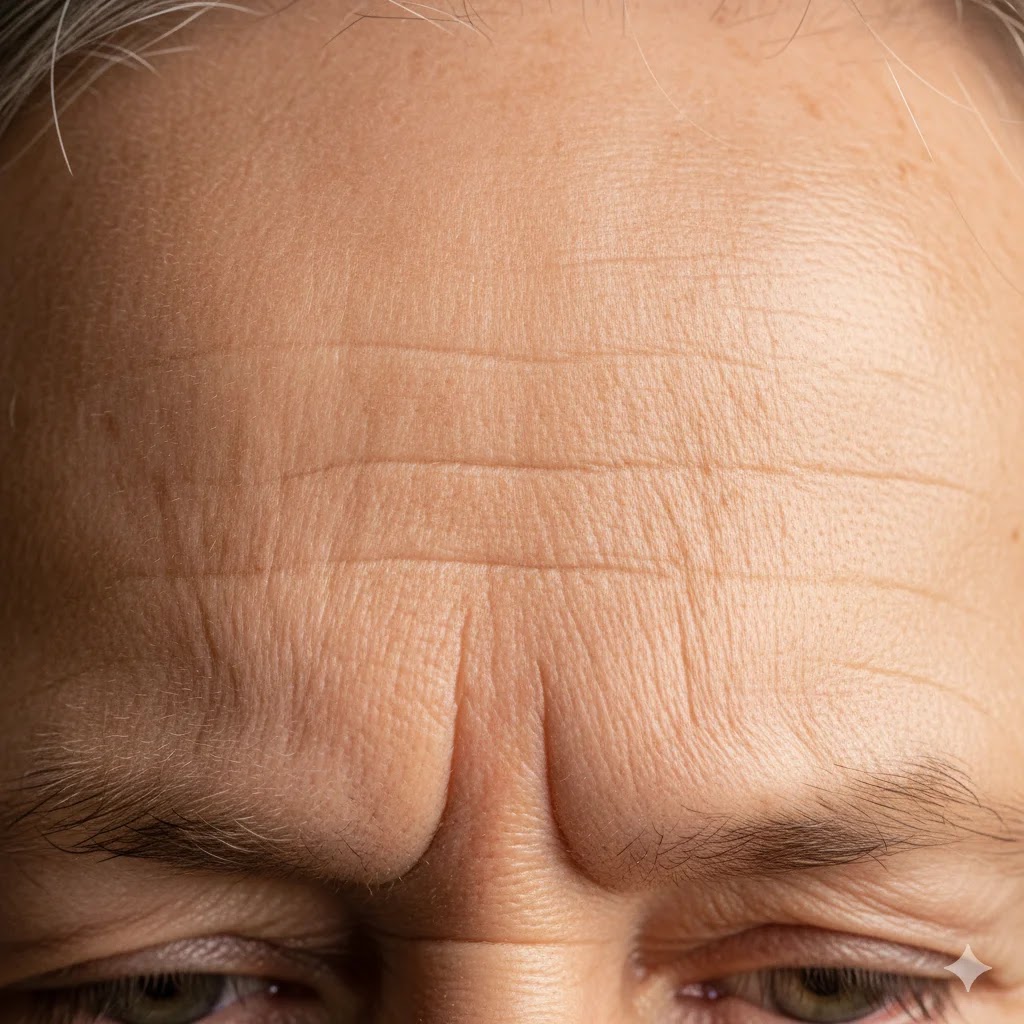 Close-up of forehead wrinkles on mature skin, showing deep static lines and natural skin texture.
