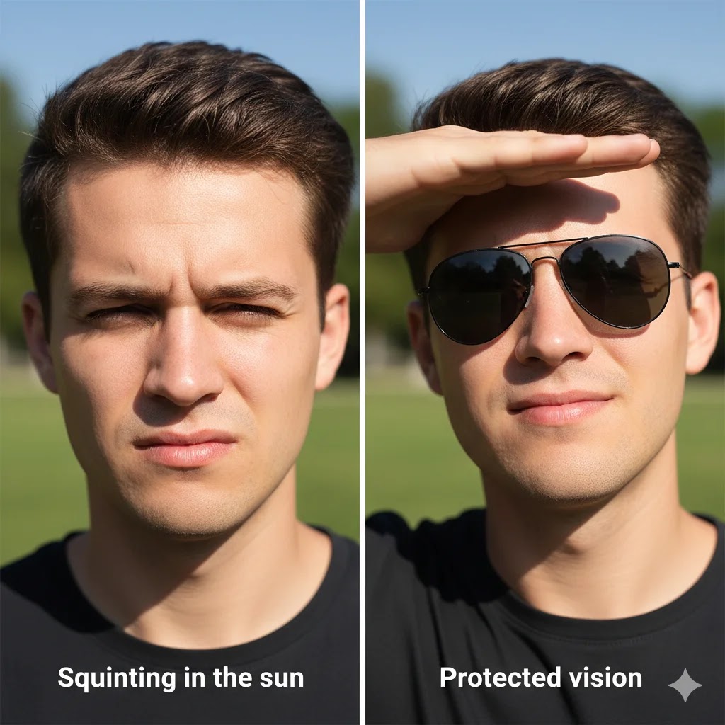 Split image comparing a young man squinting in the sun vs. wearing sunglasses for protection.