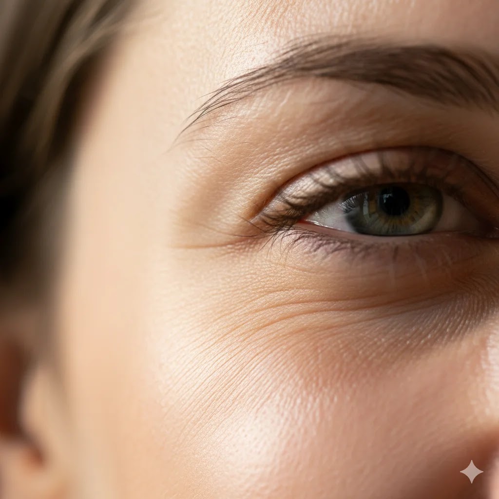 Close-up of the eye area of a person in their 30s showing faint crow's feet under sharp light.